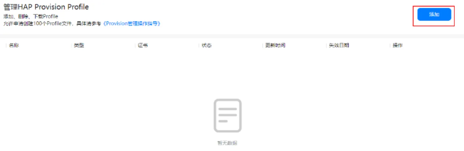 3. 导航选择“HarmonyOS应用 > HAP Provision Profile管理”,进入“管理HAP Provision Profile”页面,点击“添加”。