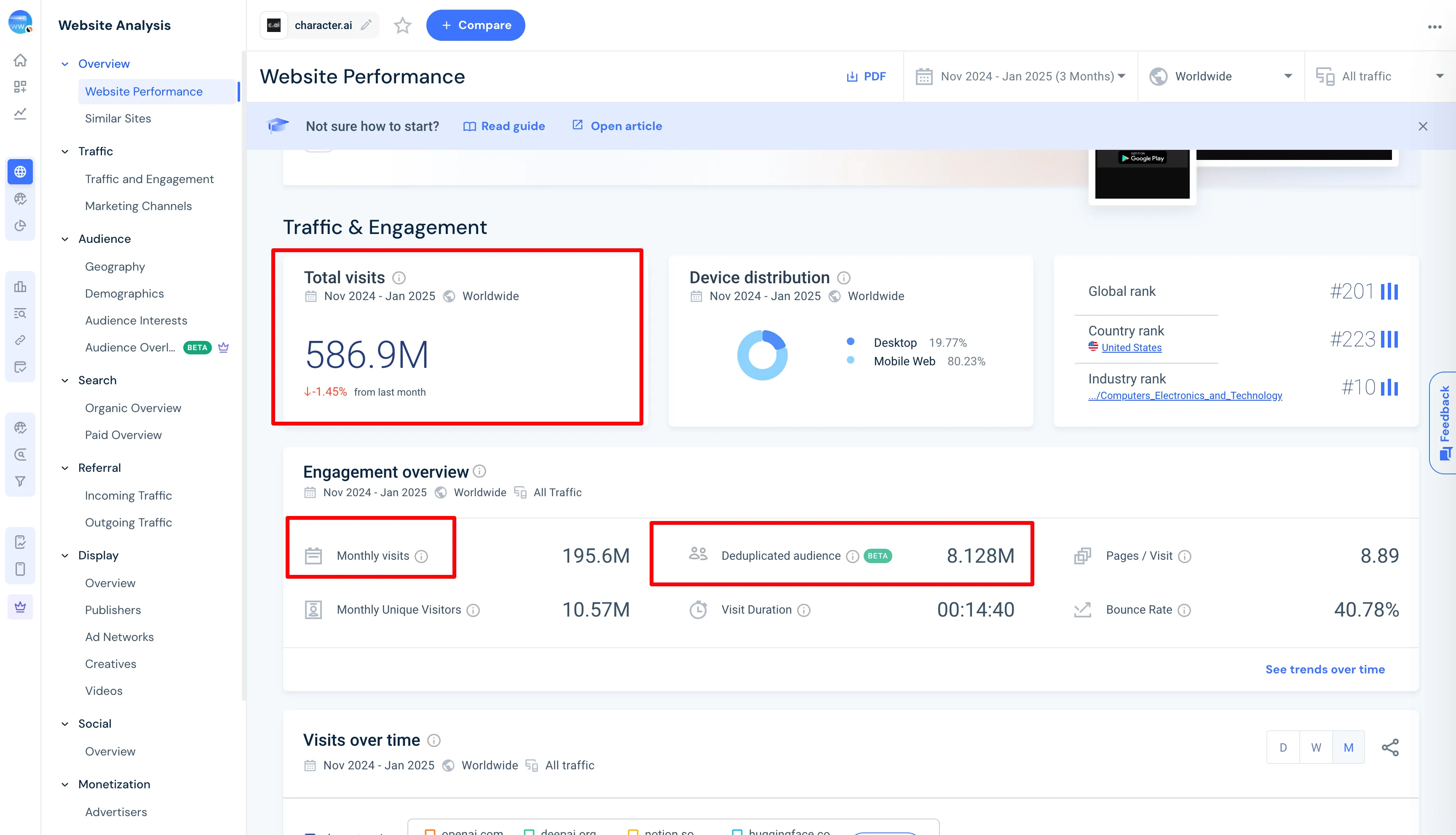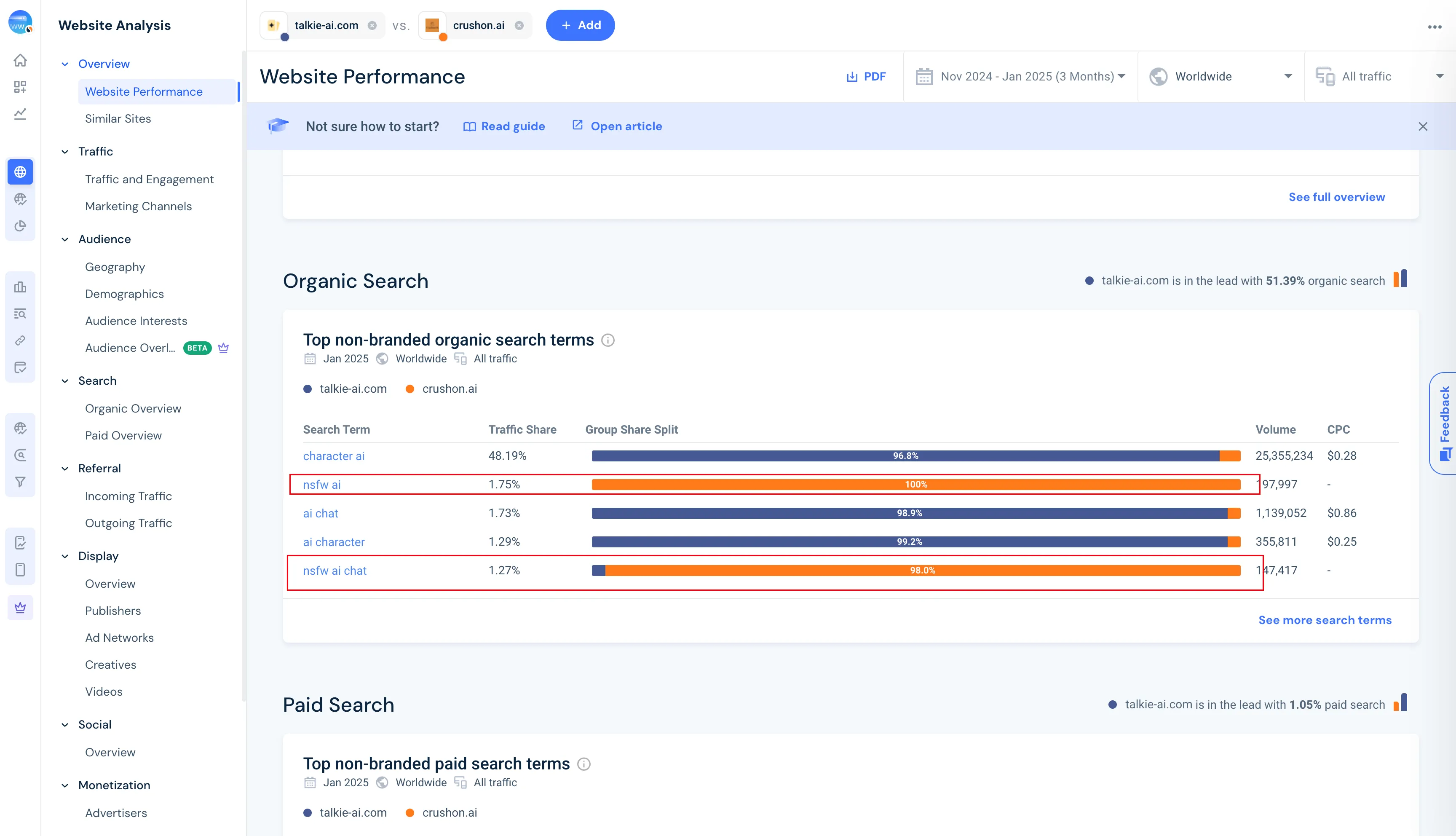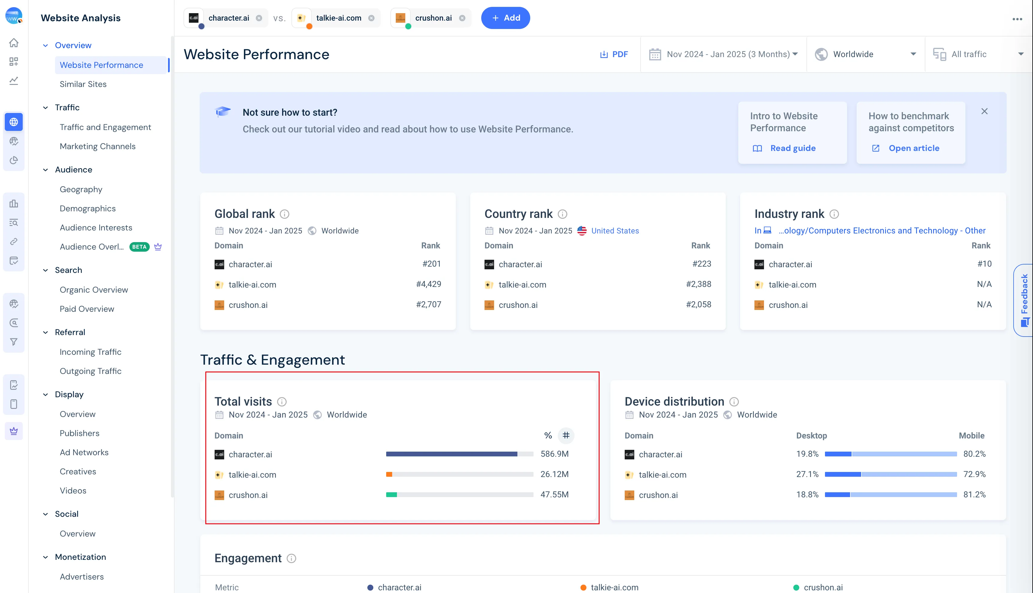 为例,它是Ai RolePlay(AI角色扮演)的行业龙头,点到website performance(网站表现),如图所示: