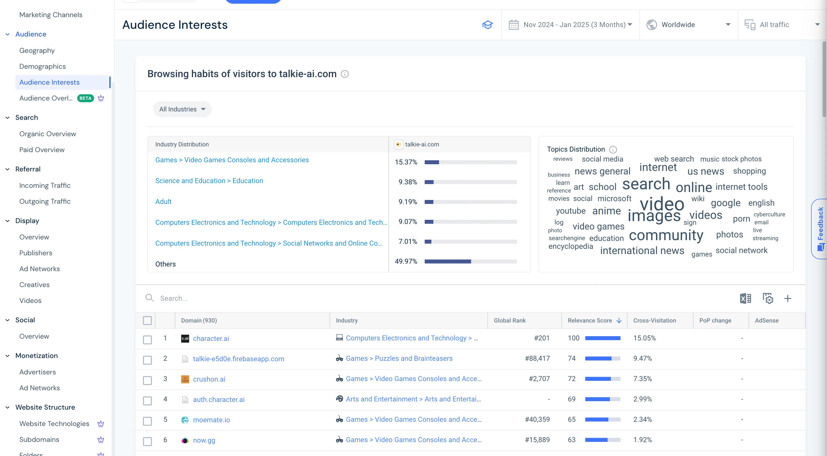 通过SimilarWeb的"Audience Interests"部分,我们可以深入了解talkie-ai.com访问者的浏览习惯和兴趣分布: