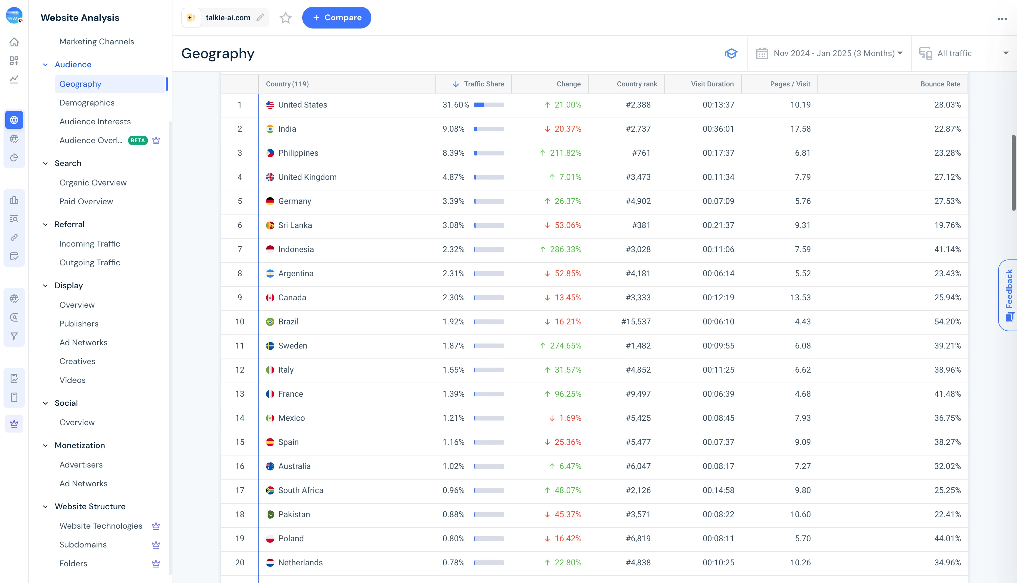 在进行SEO优化时,了解网站的流量来源和用户特征是至关重要的。这些信息可以帮助我们制定更精准的SEO策略和内容计划。接下来,我们将从地理分布、人口统计和用户兴趣三个方面对talkie的用户群体进行深入分析。