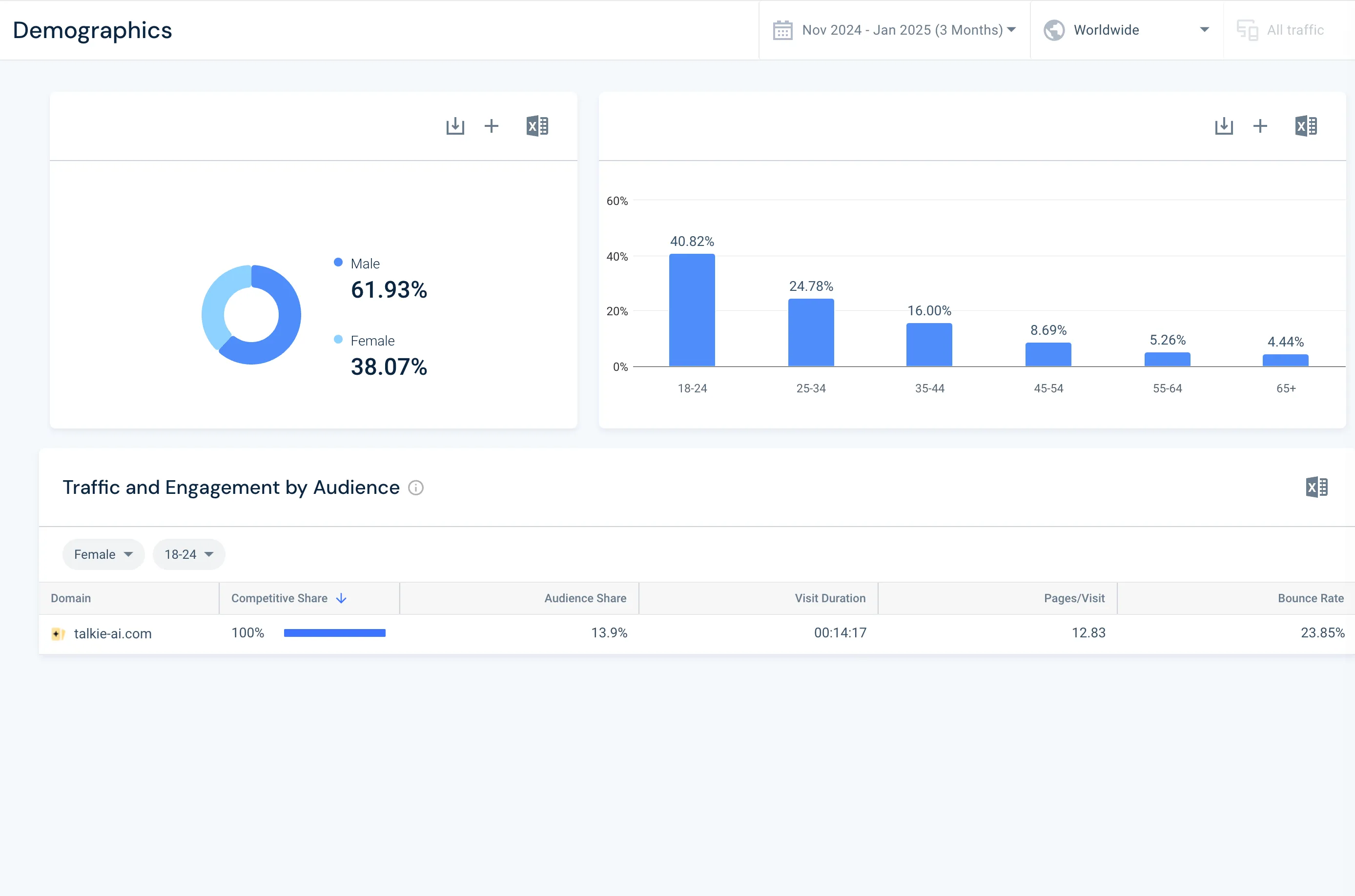 通过SimilarWeb的"Demographics"部分,我们可以了解talkie用户的基本特征: