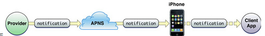 第一阶段:.net应用程序把要发送的消息、目的iPhone的标识打包,发给APNS。 第二阶段:APNS在自身的已注册Push服务的iPhone列表中,查找有相应标识的iPhone,并把消息发到iPhone。 第三阶段:iPhone把发来的消息传递给相应的应用程序, 并且按照设定弹出Push通知。