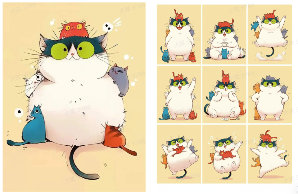 基于提供的 IP 形象,设计 9 种风格各异的姿势,涵盖站立、坐姿、动态动作(如跳跃、挥手)、静态姿态(如托腮、叉腰)等不同类型,每种姿势需贴合该 IP 的核心特征与性格特质,清晰呈现 IP 在各姿势下的整体形态与细节,最终输出包含9个姿势的九宫格图片。