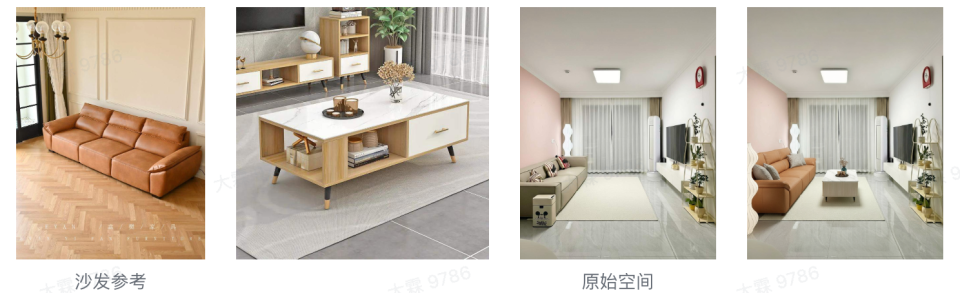 结合图片中的软装元素(包括家具、布艺、装饰摆件等),将其合理搭配组合,生成一个风格统一、布局协调的完整空间效果。需体现各软装元素的色彩呼应、材质搭配及整体氛围,呈现出自然融合的室内场景,高还原度,细节清晰。