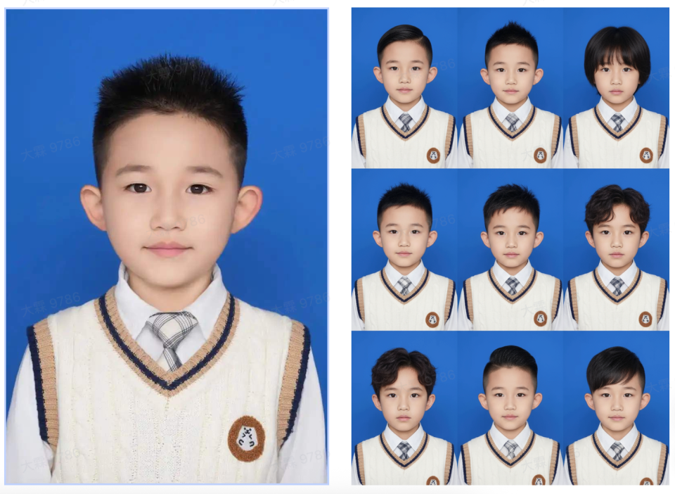 为图中人物设计 9 种风格差异显著且符合性别的发型(涵盖不同风格如日式和韩式等),清晰呈现人物搭配每种发型的面部及头部特写(突出发型与脸型的适配效果),所有特写镜头需保持一致的拍摄角度、光线和背景风格,最终整合为一张布局规整的九宫格图片,高清晰度,细节分明。