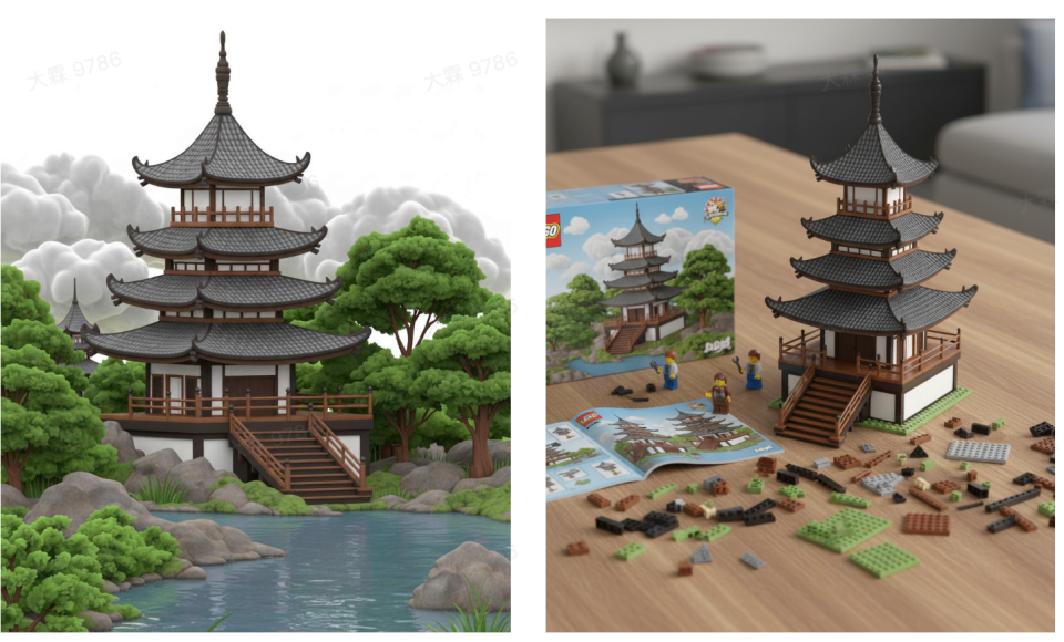 基于图1,将其转变为乐高玩具模型,真实的放在桌子上,桌子边上有乐高玩具的盒子与说明书。这个建筑正在安装过程中,有一半的模型还没有拼装好,零件散乱的放置在桌子上