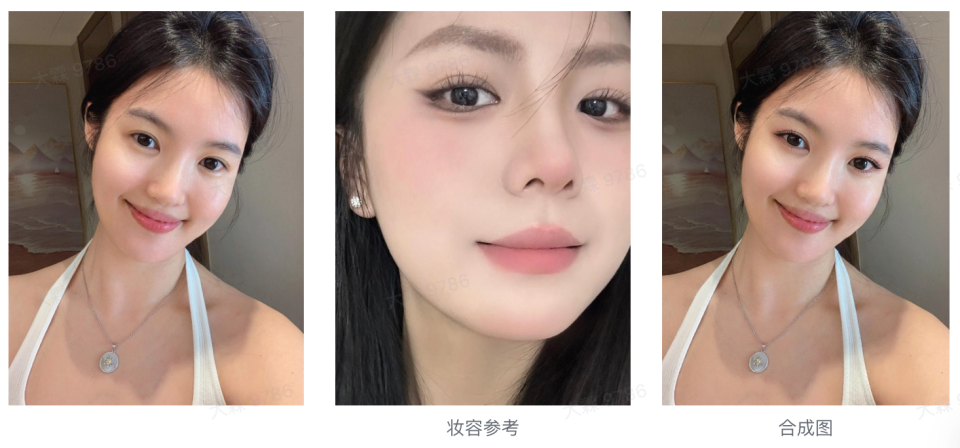 为图一人物化上图二的妆,还保持图一的姿势。其余场景保持不变。