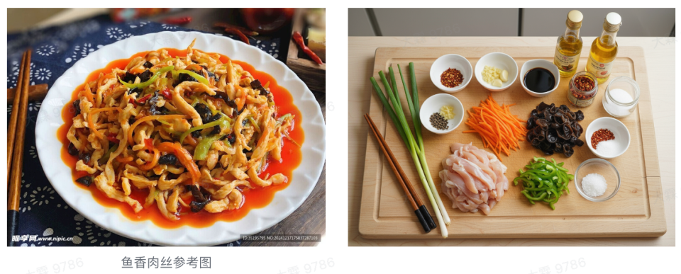 食材平铺拍摄,将成品菜肴所用的原材料整齐地摆放在干净的厨房或木质背景上,食材新鲜且未经加工,配料被放在碗和盘子里,佐料瓶也陈列其中,呈现优雅的静物美食摄影风格,从正上方或主视角拍摄,采用明亮的自然光。