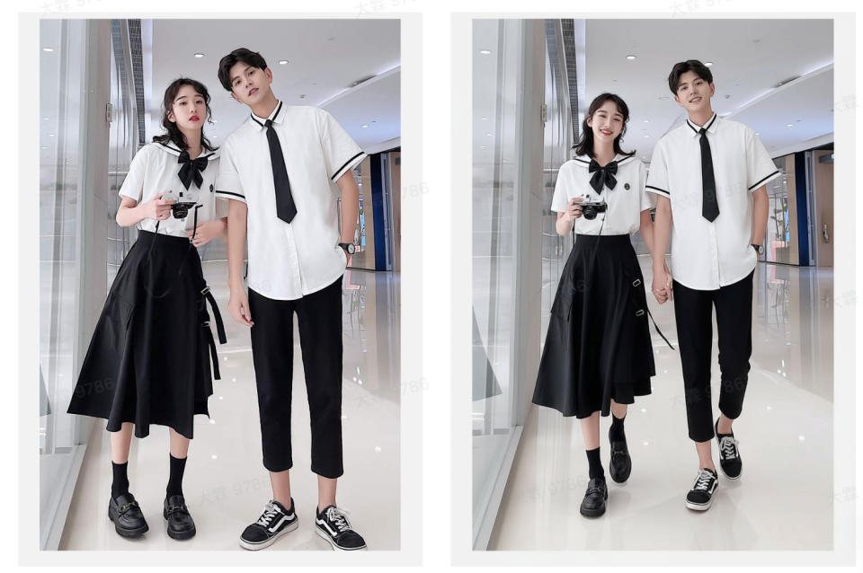 将照片中情侣姿势改为牵手一起走动,两人微笑,身体稍微前倾动作自然流畅,背景保持不变。