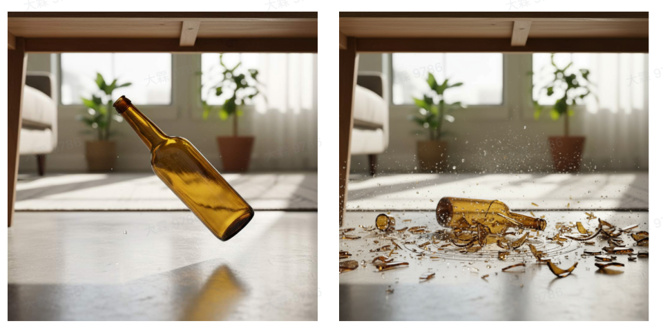 Gemini 2.5 Flash 它不只是单纯地“画画”,而是可以“理解”这个世界了。 可以推断出图像中显示的时刻之前或之后发生的事情。 比如,下面这张“玻璃瓶从桌上掉向地面”的图。 然后,你问它:“想象一下接下来会发生什么?给我生成接下来的画面”它竟然能准确预判出“瓶子会摔碎”,并生成了破碎的瞬间!