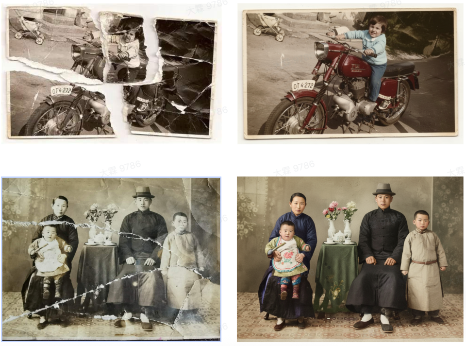 修复这张老图片并上色,清除所有划痕、瑕疵、褪色、霉斑,还原清晰五官和更多细节。无过度锐化,画面干净自然。