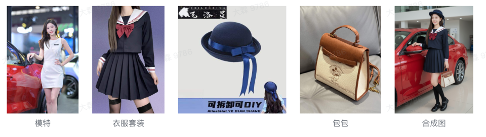 让图片1中的人穿上图中所有的服装(包括上衣、下装、外套等),并搭配图中所有的配饰(如帽子、围巾、首饰、包包、鞋子等),确保所有服饰和配饰都完整穿戴在人物身上,整体搭配自然协调,呈现出完整的造型效果,细节清晰。