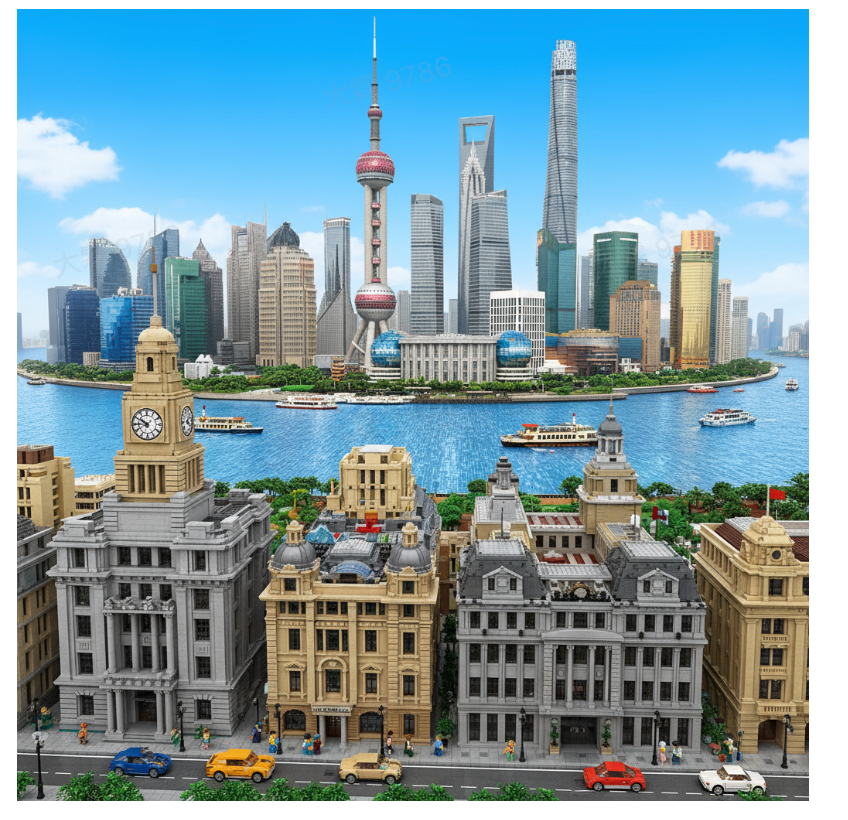 创建一幅高度精细且色彩鲜艳的乐高版【上海外滩】景象。前景呈现经典的【外滩历史建筑群】,用乐高砖块精致还原西式与新古典主义风格的建筑立面,包括钟楼、穹顶、柱廊等细节。乐高小人们正在沿江漫步、拍照、观光,街道两旁停靠着经典样式的乐高汽车。背景是【壮观的黄浦江】,以蓝色半透明乐高砖拼接,【江面上有乐高渡轮和游览船。对岸的浦东陆家嘴高楼林立,包括东方明珠塔、上海中心、金茂大厦和环球金融中心】,这些超现代乐高摩天大楼色彩丰富、造型逼真。天空为乐高明亮蓝色,点缀少量白色乐高积木云朵,整体呈现充满活力与现代感的视觉效果。