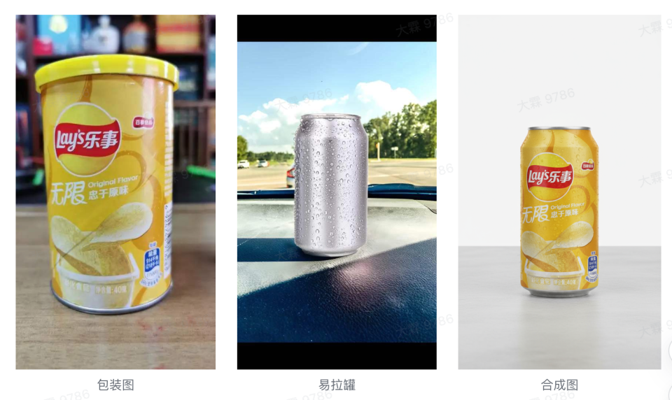 把图一贴在图二易拉罐上,并放在极简设计的布景中,专业摄影。
