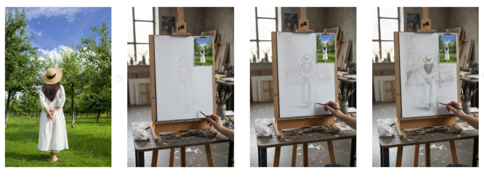 为这张图绘制如下场景,一个画师正在一个粗犷,略显凌乱的画室画一张人物速写,画板右上角夹着如图所示的照片,画板上正在绘制这张图的速写,第一人称视角,看到手臂和铅笔。分别生成三张图,每张图位置略有区别,画像内容逐渐丰富,类似绘画创作的过程图。