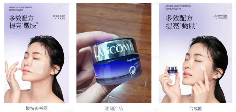 图一的女孩拿着图二的面霜,往脸上涂抹,帮我融合成一张海报。