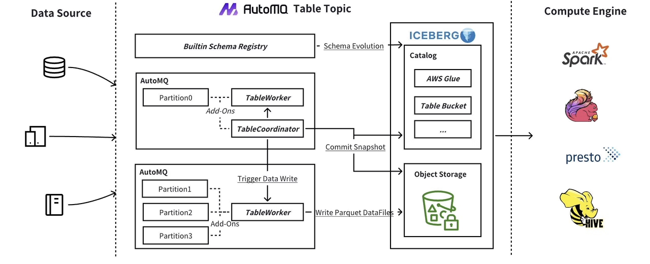 内置 Schema 注册表:Table Topic 利用已注册的 Schema 自动在目录服务(例如 AWS Glue)中创建 Iceberg 表,并支持自动 Schema 演化。
