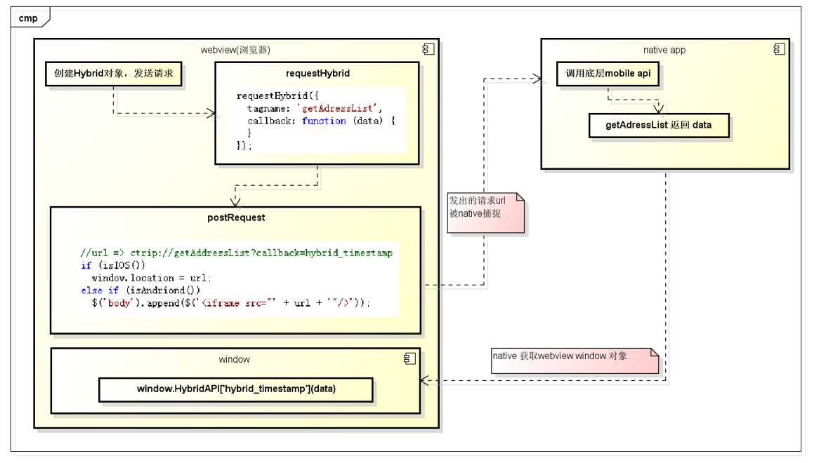 所以我在实际设计Hybrid交互模型时,是以接口为单位进行设计的,比如获取通讯录的总体交互是: