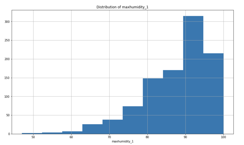 %matplotlib inline plt.rcParams['figure.figsize'] = [14, 8] df.maxhumidity_1.hist() plt.title('Distribution of maxhumidity_1') plt.xlabel('maxhumidity_1') plt.show()
