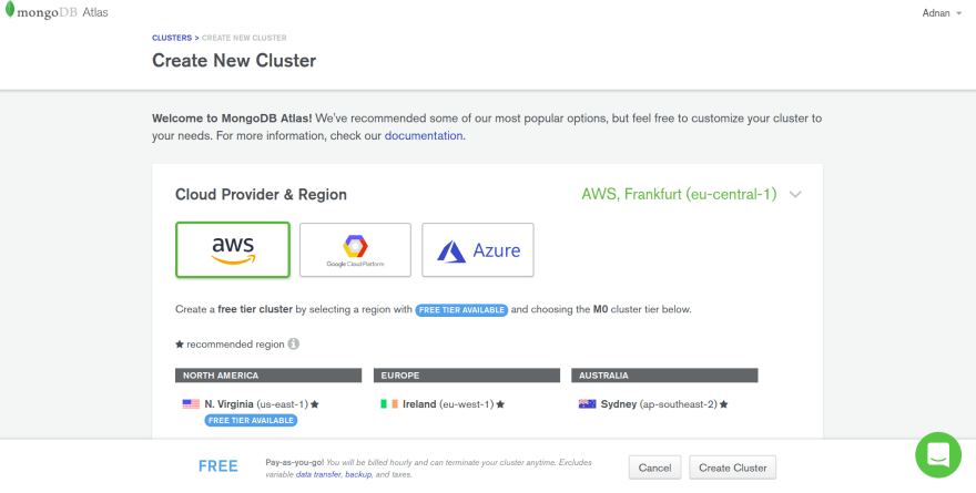 好,我们来开始创建实际的集群!按下巨大的绿色“构建新群集”按钮。这将打开一个巨大的集群创建窗口。您可以将所有内容保留为默认值,只需确保选择M0实例大小,然后禁用备份。正如您所看到的,此群集的价格将是免费的。相当不错。就是这样,点击“创建群集”。