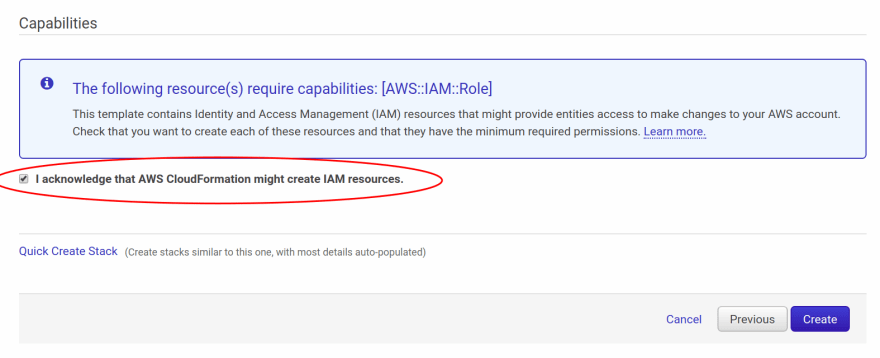 您需要做的就是不停点下一步,直到您到达名为我确认AWS CloudFormation可能会创建IAM资源框的复选框,选中并创建栈即可。