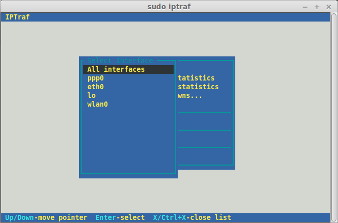 如果iptraf命令不带任何命令行选项执行,该程序就会以交互模式显现,可以通过主菜单获得各种各样的工具。