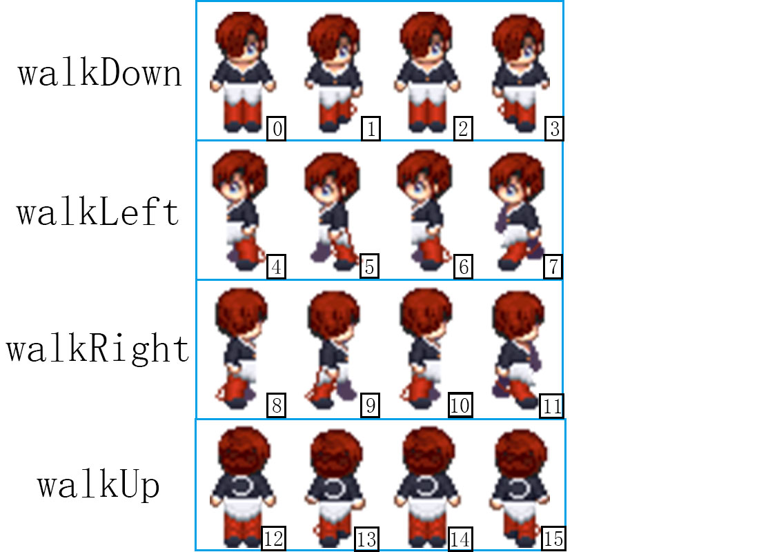 精灵的动画状态定义了精灵移动时的四个动作序列。这些状态是:walkDown,walkLeft,walkRight,和walkUp 。下图显示了这些状态在雪碧图上的位置。