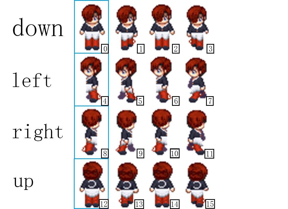 精灵的静态状态定义精灵在不移动时的四个位置。这些状态是:down, left, right,和up。下图显示了雪碧图上的状态以及标识这些状态的帧号。