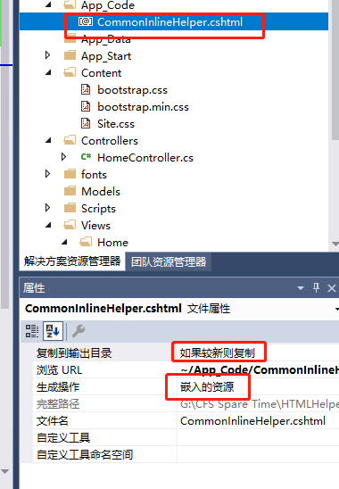我们这样改:把App_Code文件夹下的视图页面,属性改成嵌入的资源和如果较新则复制