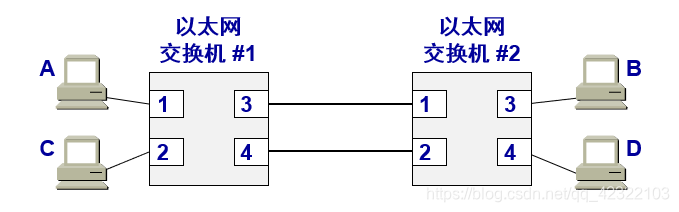 如图,假定开始时,交换机 #1 和 #2 的交换表都是空的,主机 A 通过接口交换机 #1 向主机 B 发送一帧。