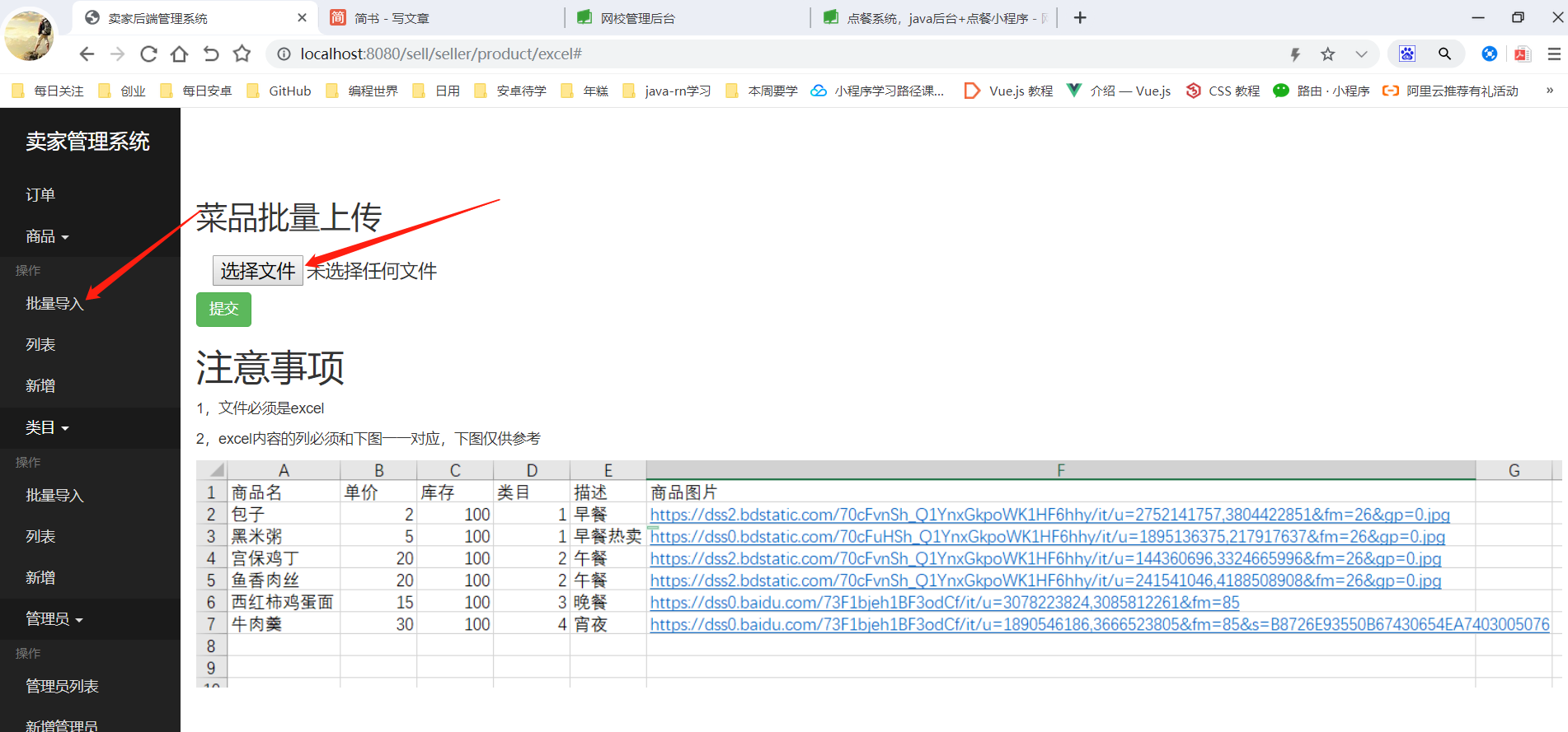 到这里我们就完整的实现了点餐系统批量导入菜品数据到数据库的功能了。