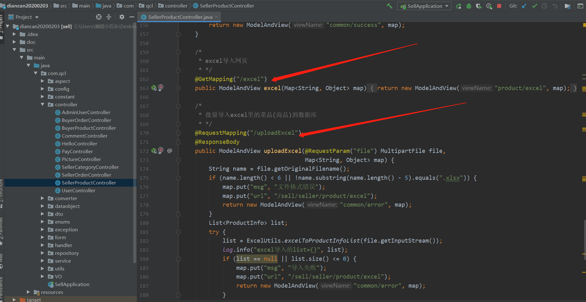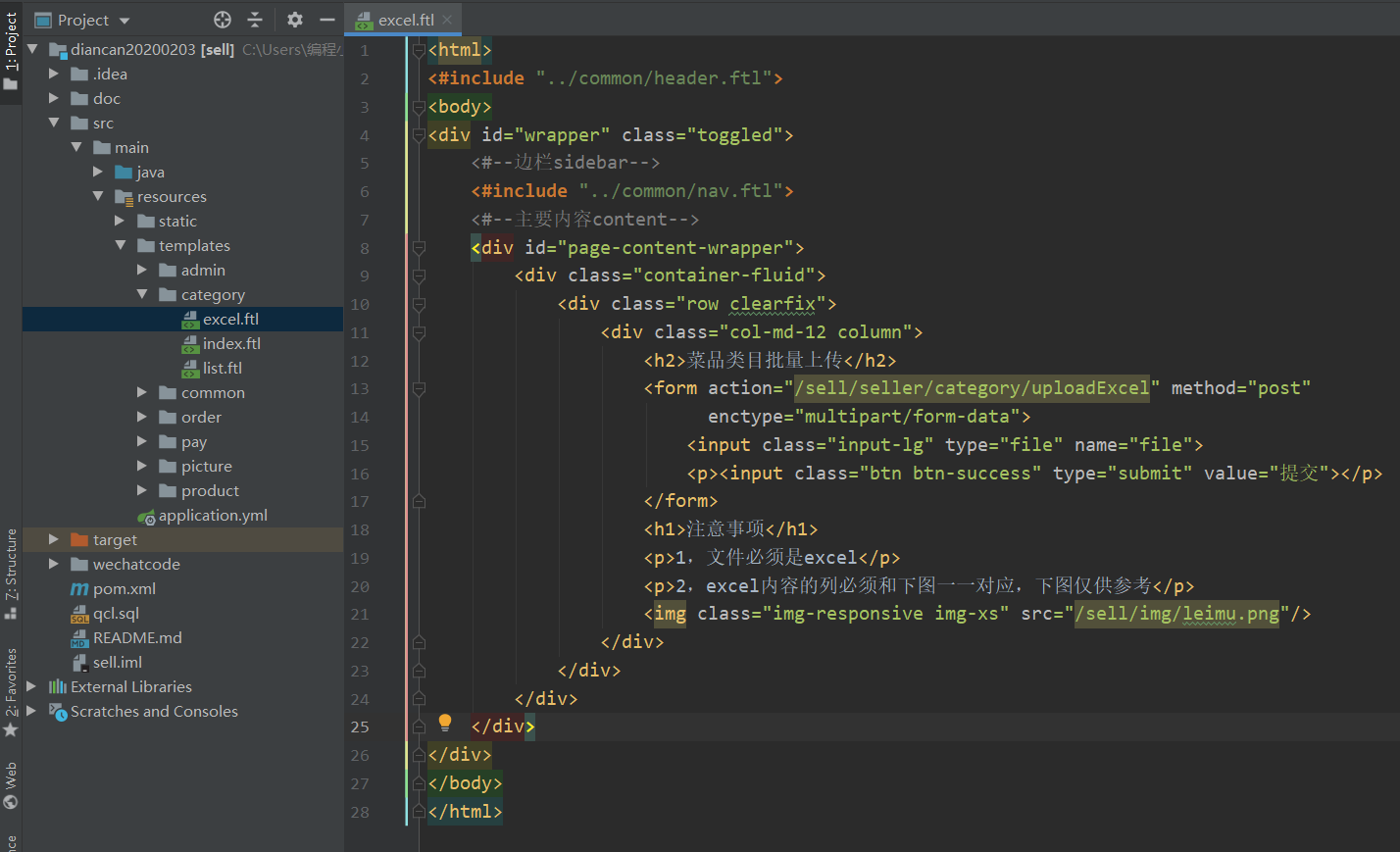 把完整代码给大家贴出来,其实很简单,就是在工具类里定义一个导入菜品类目和菜品的方法。