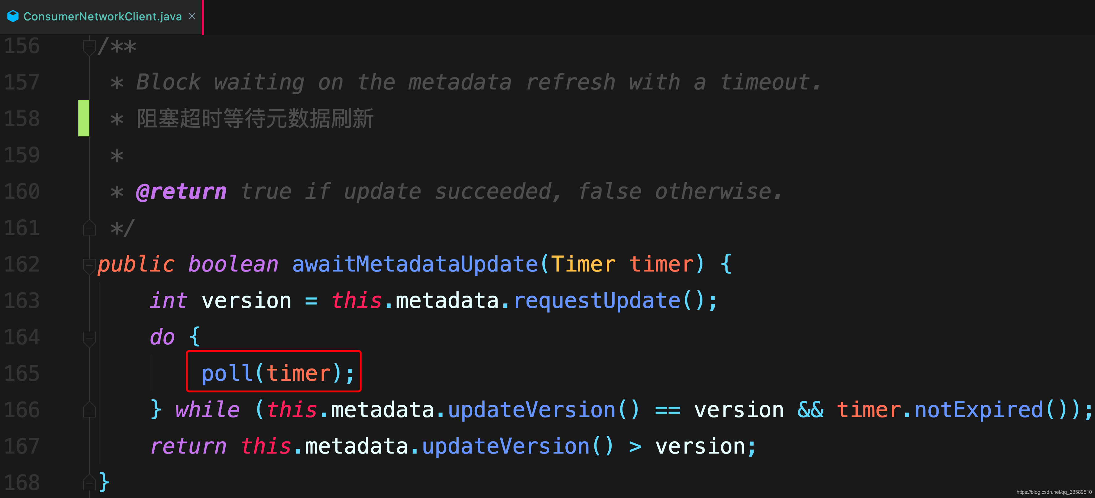 这里,并未真正发送更新元数据的请求,只是将需要更新元数据的标志位needUpdatetrue。Kafka必须确保在第一次拉消息前元数据可用,即必须更新一次元数据,否则Consumer不知道应该去哪个Broker拉哪个Partition的消息。