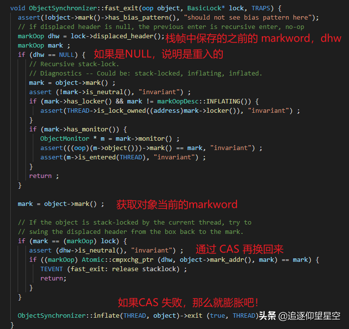 逻辑还是很简单的,就是要把当前栈帧中 LockRecord 存储的 markword (dhw)通过 CAS 换回到对象头中。