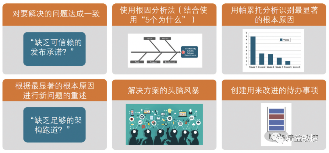 首先,每个小敏捷团队分享自己团队多个迭代的回顾会议产出和改进结果,以及自己团队解决不了而希望整个产品层面可以进行改进的事项。其次,每个团队成员使用小圆点进行投票选择希望改进的事项。再次,每个团队成员重新组队,选择一个改进事项参加后续的讨论。最后,每个新组建的团队采用如下六步法针对一个需要改进的问题,进行问题解决工作坊。