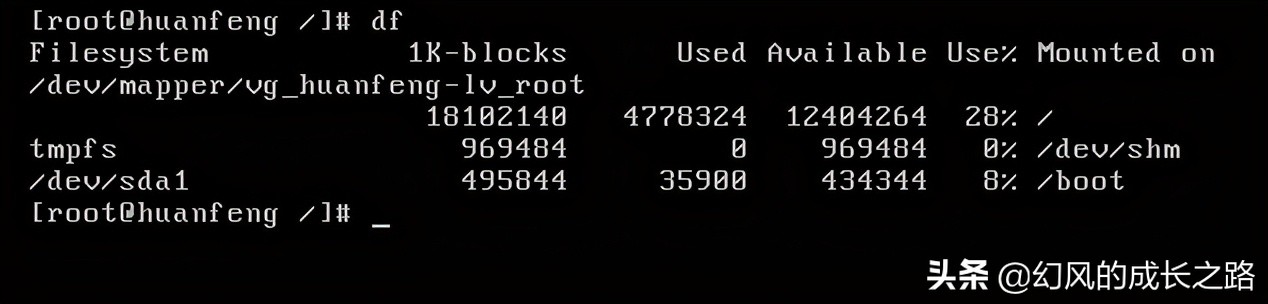 使用df命令可以看到当前的目录挂载到哪个分区中,其中/挂载到/dev/…中,那么/下面的所有子目录也是挂在到/dev/…中的,而/boot是引导程序,它会挂在到/dev/sda1下面