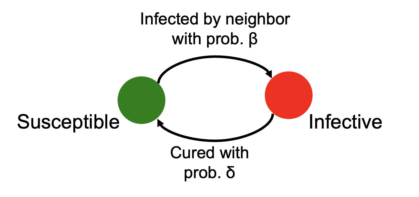 易感-感染-易感(SIS)模型治愈的节点立即变得易感病毒的``强度’’: s=β/δ节点状态转换图: