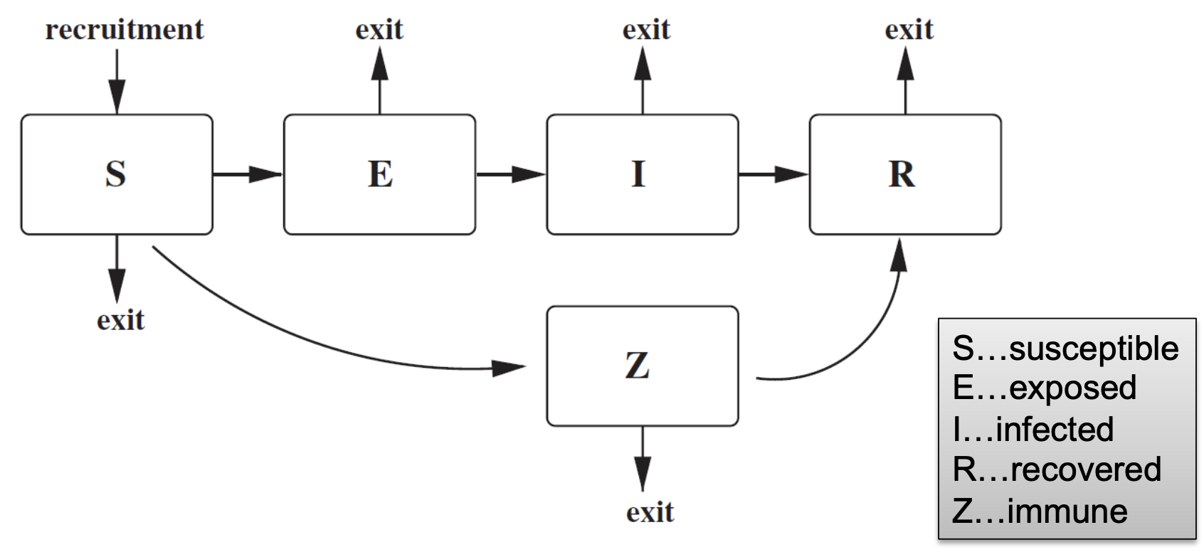S:易感人群,E:暴露人群,I:社区感染病例,H:住院病例F:死亡但尚未埋葬,R:不再传播疾病的个人