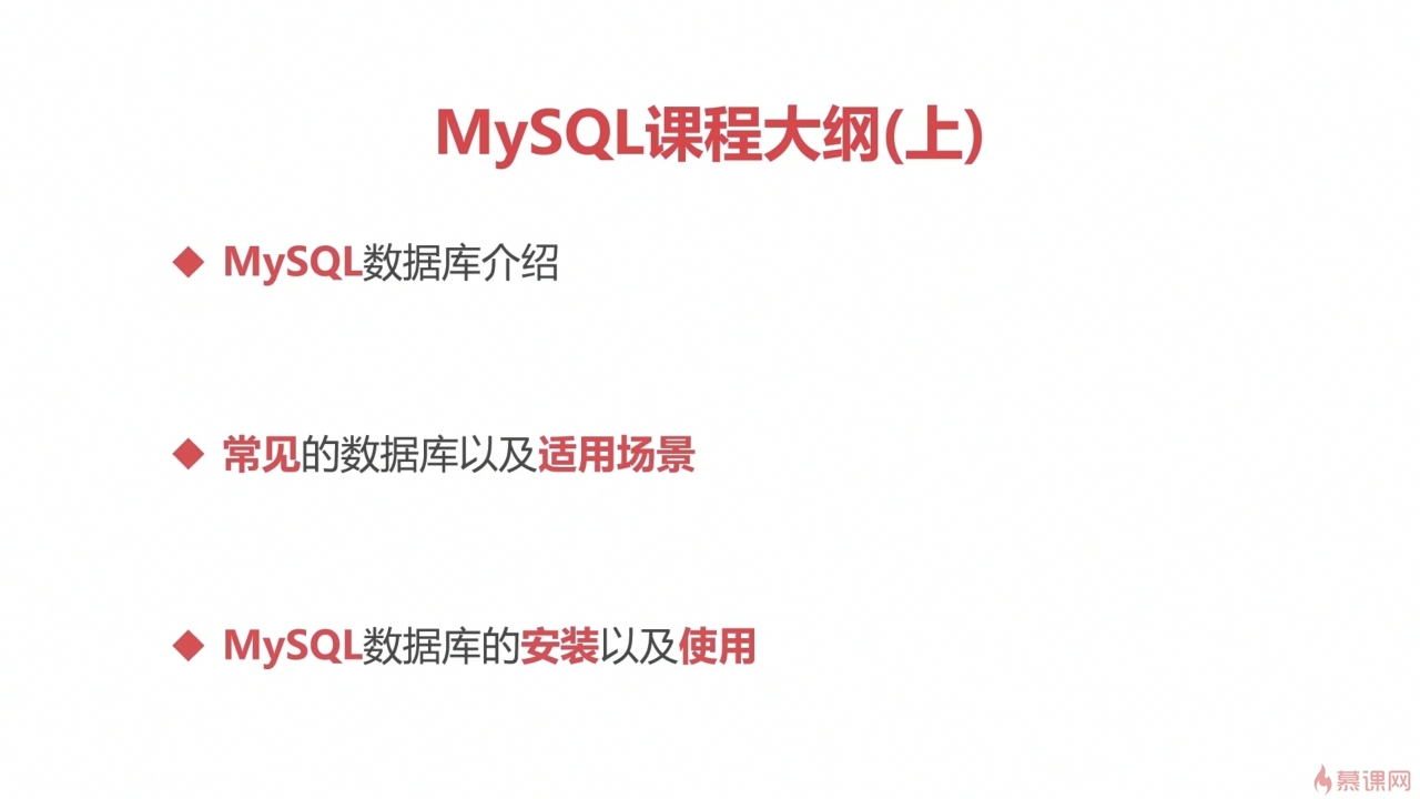 MySQL课程大纲(上) 1、MySQL数据库介绍 2、常见的数据库以及适用场景 Oracle SQLServer MySQL SyBase DB2 SQLite 3、MySQL数据库的安装以及使用 MySQL课程大纲(下) 4、SQL语句的介绍 数据库安装成功之后,即可通过SQL语句进行操作 5、SQL语句的分类,DDL, DML, DQL,DCL SQL语句之DDL语句 DDL语句操作数据库以及表的create(增加),drop(删除),alter(修改)等 SQL语句之DML语句 DML语句对表数据进行insert(增),delete(删),update(改)等 SQL语句之DQL语句 DQL语句对表数据进行各种维度select查询(简单查询、条件查询、模糊查询、分组查询) 6、MySQL数据库约束 保证数据的正确性、有效性和完整性 主键约束,唯一约束,非空约束