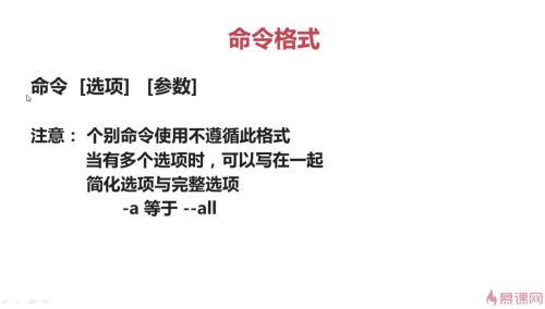 命令名 [选项] [参数] 中括号表示可以不填,多个选项可以连着写,如ls -al