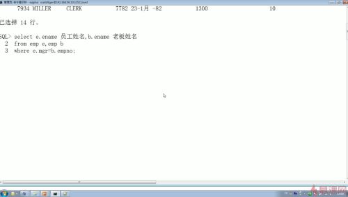 2select e.ename 员工姓名,b.ename 老板姓名 from emp e,emp b