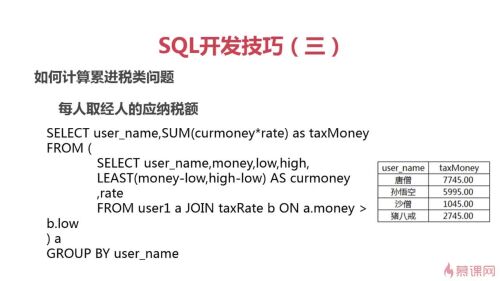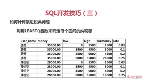 select a.user_name,money,low,high, least(monwy-low,high-low) as curmoney ,rate from user1 a join taxRate b on a.money>b.low order by user_name,low;