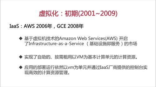 同样是在这一时期,当有了虚拟化技术解决方案之后,虚拟化技术的应用也逐渐跟上,标志性的事件就是亚马逊和谷歌公司相继推出了AWS和GCE的虚拟化主机租用服务,开启了技术设施即服务的IaaS的市场。